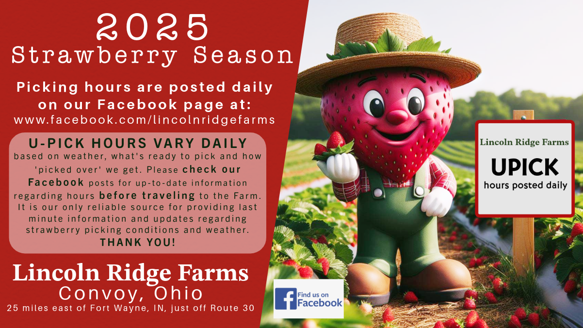 THE 2025 STRAWBERRY SEASON begins Friday, May 30th and is expected to continue 4 weeks! Check our Facebook page for current UPICK hours.